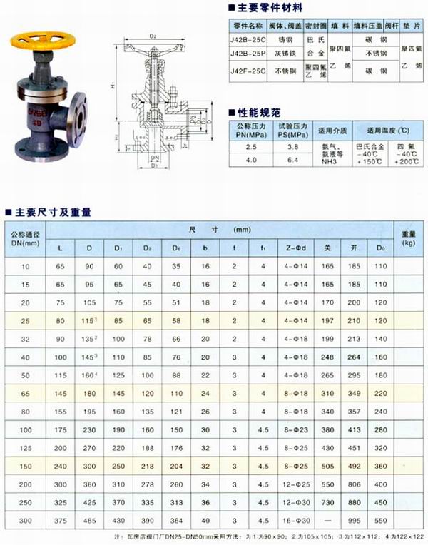 J41B氨用截止阀经常要用到氧气、氮气、氢气、氩气等气体。这些气体一般都是贮存在专用的高压气体中。使用时通过氨用截止阀使气体压力降至实验所需范围,再经过其它控制阀门细调,使气体输入使用系统。最常用的减压阀为氨用截止阀,简称氨用阀。 1,J41B氨用截止阀的外观及工作原理。 J41B氨用截止阀的高压腔与钢瓶连接,低压腔为气体出口,并通往使用系统。高压表的示值为钢瓶内贮存气体的压力。低压表的出口压力可由调节螺杆控制。 使用时先打开钢瓶总开关,然后顺时针转动低压表压力调节螺杆,使其压缩主弹簧并传动薄膜、弹簧垫块和顶杆而将活门打开。这样进口的高压气体由高压室经节流减压后进入低压室,并经出口通往工作系统。转动调节螺杆,改变活门开启的高度,从而调节高压气体的通过量并达到所需的压力值。 J41B氨用截止阀都装有安全阀。它是保护氨气减压阀并使之安全使用的装置,也是氨气减压阀出现故障的信号装置。如果由于活门垫、活门损坏或由于其它原因,导致出口压力自行上升并超过一定许可值时,安全阀会自动打开排气。 2. J41B氨用截止阀的使用方法 (1)按使用要求的不同,氨气减压阀有许多规格。最高进口压力大多为,最低进口压力不小于出口压力的2.5倍。出口压力规格较多,一般为,最高出口压力为。 (2)安装氨气减压阀时应确定其连接规格是否与使用系统的接头相一致。氨用截止阀采用半球面连接,靠旋紧螺母使二者完全吻合。因此,在使用时应保持两个半球面的光洁,以确保良好的气密效果。安装前可用高压气体吹除灰尘。必要时也可用聚四氟乙烯等材料作垫圈。 (3)氨用截止阀应严禁接触油脂,以免发生火警事故。 (4)停止工作时,应将减压阀中余气放净,然后拧松调节螺杆以免弹性元件长久受压变形。 (5) J41B氨用截止阀应避免撞击振动,不可与腐蚀性物质相接触。